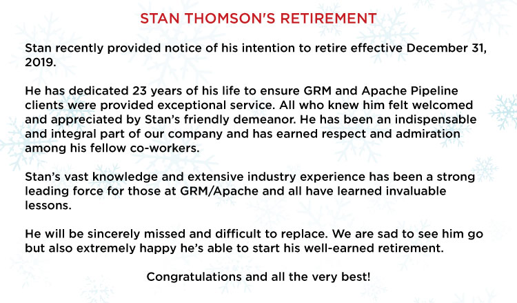 We’d also like to wish Stan Thomson congratulations on his retirement! Stan recently provided notice of his intention to retire effective December 31, 2019. He will be sincerely missed and difficult to replace. We are sad to see him go but also extremely happy he’s able to start his well-earned retirement. Congratulations and all the very best Stan!