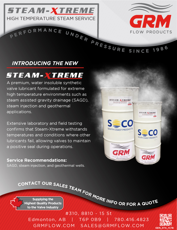 Introducing the new Steam-Xtreme! A premium, water insoluble synthetic valve lubricant formulated for extreme high temperature environments such as steam assisted gravity drainage (SAGD), steam injection and geothermal applications.