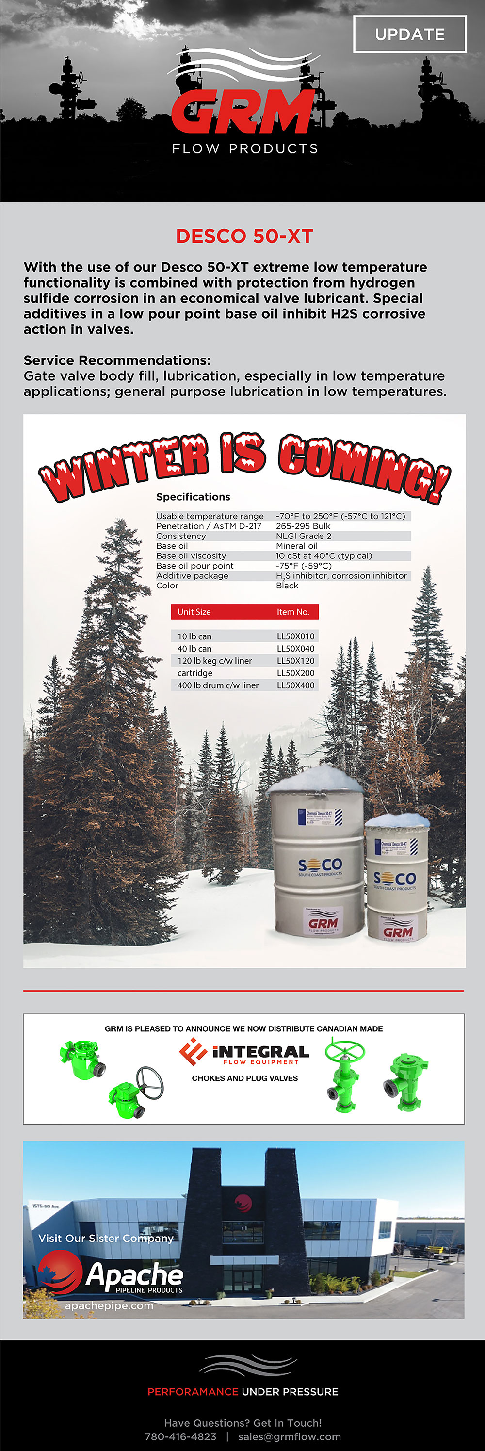 With the use of our Desco 50-XT extreme low temperature functionality is combined with protection from hydrogen sulfide corrosion in an economical valve lubricant. Special additives in a low pour point base oil inhibit H2S corrosive action in valves. Click here for more info or contact us.